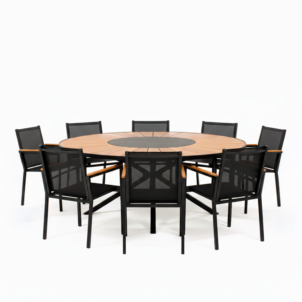 O tampo da mesa e os braços das poltronas em madeira Cumaru agregam charme natural e um visual sofisticado, criando o equilíbrio perfeito entre o rústico e o contemporâneo. O centro giratório em alumínio maciço proporciona mais praticidade no dia a dia, facilitando o acesso aos itens durante as refeições.