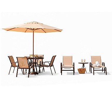 O conjunto também conta com ombrelone em madeira Cumaru com tecido bagum, que oferece excelente proteção solar e um toque sofisticado ao ambiente.