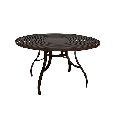 O tampo ripado em alumínio garante um acabamento contemporâneo e elegante, além de proporcionar praticidade no uso diário. O modelo também conta com furo central opcional, ideal para utilização com guarda-sol ou ombrelone, deixando o ambiente ainda mais confortável em dias de sol.