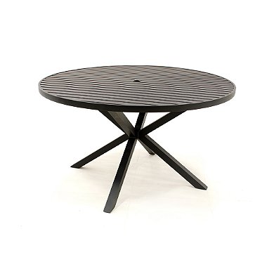 O tampo ripado em alumínio proporciona um acabamento elegante e contemporâneo, além de ser fácil de limpar e altamente resistente ao tempo. O modelo também conta com furo central opcional, ideal para utilização com ombrelone ou guarda-sol, trazendo mais conforto para áreas abertas.